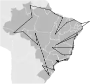 The relay toured through 42 Brazilian cities - each one representing a different country in the Pan American Games. Over 2,500 torchbearers carried the flame over 11,000 kilometers.[2][3] The first torchbearer was carried by Wilson Carneiro, the first Brazilian to win a medal at the Pan American Games,[4] white the final torchbearer was Naiane Freire da Purificação.[5]