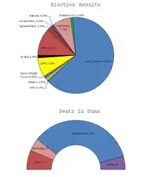 Legislative elections were held in the Russian Federation on 2 December 2007.[1] At stake were the 450 seats in the 5th State Duma, the lower house of the Federal Assembly (the legislature). Eleven parties were included in the ballot, including Russia's largest party, United Russia, which was supported by President of Russia Vladimir Putin. Official results showed that United Russia won 64.3% of the votes, the Communist Party of the Russian Federation 11.6%, the Liberal Democratic Party of Russia 8.1%, and Fair Russia won 7.7%, and none of the other parties won enough votes to gain any seats.
