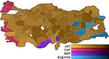 ![]() Most voted-dor party by province AKP CHP MHP Independent Thousand Hope Candidates The Thousand Hope Candidates contested the election as independents to bypass the 10% election threshold. Provinces & districts where the total votes for all independents combined topped the poll are shown in purple, even though these candidates may have won fewer votes than other parties individually. | |||||||||||||||||||||||||||||||||||||||||||||