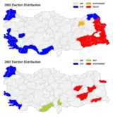 General elections were held in Turkey on 22 July 2007 to elect 550 members to the Grand National Assembly. Originally scheduled for November, the elections were brought forward after parliament failed to elect a new president to replace Ahmet Necdet Sezer. The result was a resounding victory for the incumbent Justice and Development Party (AKP), which won 46.6% of the vote and 341 seats. The party's leader Recep Tayyip Erdoğan was consequently re-elected as Prime Minister of Turkey. The opposition Republican People's Party (CHP) came second with 20.9% of the vote and took 112 seats. The Nationalist Movement Party (MHP), which had failed to surpass the 10% election threshold in the 2002 election, re-entered parliament with 14.3% of the vote and 71 MPs.[1] The election was fought mostly on Turkey's debate over laïcité that had been perceived to be under threat from the AKP's nomination of Foreign Minister Abdullah Gül, an Islamist politician, for the Presidency. Developments in Iraq (explained under positions on terrorism and security), secular and religious concerns, the intervention of the military in political issues, European Union membership negotiations, the United States and the Muslim world were other main issues.
