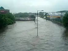 By 15 June, towns and villages in North Yorkshire were flooded, with Knaresborough, Harrogate and York being particularly affected.[96] The A59 road at Kex Gill was closed due to a landslip where 100 tonnes (110 tons) of earth slide down the hillside and trapped a couple in their car.[97][98] In Scarborough, the main A171 Scalby Road flooded outside Scarborough Hospital, and the ornamental lake at Peasholm Park overtopped its banks and poured down Peasholm Gap into North Bay. Near Catterick, North Yorkshire, a 17-year-old soldier on a training exercise from Catterick Garrison died after being swept away whilst crossing Risedale Beck, Hipswell Moor.[99] On 23 June, flooding affected Middlesbrough.[37] Pickering was flooded after Pickering Beck overflowed its banks. On 18 July, streams overflowed and roads were blocked in Barton, Gilling West, Melsonby, Hartforth, Scotch Corner, Middleton Tyas and Kirby Hill after a freak rainstorm,[100] and on 18 July 2007 a cloud burst left parts of Filey under 3 feet (1 m) of water, just caused by the rain, rather than by a river bursting its banks. Pensioners were stranded in the town's swimming pool and rescued by lifeboat.[101]