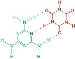 Melamine (green) and cyanuric acid(red) easily form hydrogen bonds (blue dotted lines) with each other