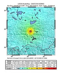 The 2008 Damxung earthquake hit Damxung County, Xizang (Tibet), west of Lhasa, in the People's Republic of China around 16:30 China Standard Time on October 6. The Chinese state media reported that the earthquake caused 10 deaths as of October 7.[2] Three aftershocks above magnitude 5 followed.[4][5][6]