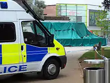 ![]() A police van guards the Giraffe cafe and restaurant. | |