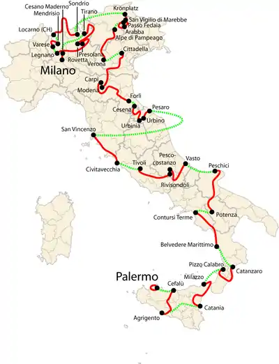 route from Palermo to Milan covered by the riders on the bicycle (red)