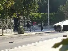 Following some exchange of verbal abuse that, according to several witnesses, was initiated by the guards, one fired his gun.[14][15] The guards said that a group of youth had thrown stones and other items at them.[16] Eyewitnesses who spoke to Greek media, however, reported that the special guards were not attacked by the youths, nor was their physical safety put in danger at any time. Instead, the special guards approached the group and verbally assaulted them in order to provoke them.[17][18] The special guard said he fired three rounds, two warning shots in the air and a third aimed on the ground. Several eyewitnesses said they believed the policeman had directly targeted the youngsters.[19][20][21]