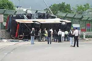 On 1 May 2008, at 8:30 am, two tour buses carrying several members of the Shinji Shumeikai Hong Kong branch left from Tsz Wan Shan for Sai Kung. At around 9:02, one of the tour buses rolled over when entering the Hiram's Highway roundabout in Nam Pin Wai. The bus flipped onto its side and struck a noise barrier, causing the roof of the bus to collapse, trapping many passengers between the roof and the seats, and hindering rescue efforts.[3][4]