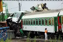 The train struck the obstacle within just a few seconds, by which time the train had slowed to 90 km/h (56 mph). The locomotive and four carriages derailed after the impact; the carriage coupled directly behind the locomotive sustained the most damage.[3] Six other carriages, among them the restaurant carriage, remained on the track. Three freight vans on another track were also derailed.[1] At the time of the accident, there were approximately 400 people on board the train,[4] 105 of them of Polish nationality.[5] There was also a group of people travelling to an Iron Maiden concert in Prague.[6][7][8]