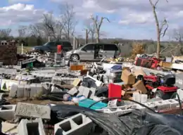 The tornado then tracked into Trousdale County and passed through rural areas to the northwest of Hartsville, weakening slightly to high-end EF2 strength. Frame homes were damaged or destroyed, vehicles were tossed and damaged, numerous trees were snapped and denuded, and mobile homes were obliterated with debris and insulation strewn long distances downwind. Ten homes were destroyed, and 23 homes had major damage along this segment of the path. As a result of the tornado, a major fire occurred as a natural gas plant was ripped apart by the tornado in the southwestern portion of the county. The area was evacuated and no one was injured at the plant. Two people were killed at a home along U.S. Route 231, and five other people were injured in the county.[65][66][4][67] Crossing into Macon County, the tornado regained EF3 intensity as it struck the western and northern sections of Lafayette, resulting in widespread, major destruction in the area. Numerous homes and several churches were destroyed in Lafayette, with several leveled to the ground. An auto sales business in town sustained heavy damage as well. Surveyors observed major damage to a large, expensive brick home that was built unanchored on a very weak, unreinforced cinder block foundation. The house shifted off the foundation during the tornado, causing walls to buckle and collapse. 170 homes were destroyed, and 9 homes had major damage in the Lafayette area. Thirteen people were killed in and around town, and 44 others were injured. President George W. Bush toured the Macon County destruction on February 8 and promised relief to individuals.[68] The logging industry in Macon County was hit hard, with about a million dollars worth of trees destroyed. Debris from Lafayette was found as far north as Sano, Kentucky, in Adair County, approximately 70 miles (113 km) to the northeast.[69] Sixteen thousand TVA electricity customers in Macon and Trousdale Counties lost power, some of whom did not have their service restored for a week.[70][71] Macon County schools were closed until February 19.[72][73][74][75] In total, roughly 260 houses in the three Tennessee counties were destroyed, and damage amounts were estimated at $78 million in Macon County alone.[76][77]