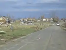 At approximately 1:00 a.m. CST (0700 UTC), the broken squall line that had affected Oklahoma and Missouri entered the state of Alabama.[81] Individual supercell storms began to develop ahead of the squall line along the Alabama–Mississippi border due to the strengthening of the upper-level jet stream.[11] A supercell that developed over Starkville, Mississippi, and tracked over Lamar, Marion and Fayette Counties in Alabama spawned a tornado in Lawrence County, Alabama, at 3:02 a.m. CST (0902 UTC).[82][83] The tornado touched down south of Moulton near the William B. Bankhead National Forest.[84] Many houses were damaged or destroyed, and a church was leveled. Three fatalities, all from a single family, were reported north of Aldridge Grove. A large, brick, two story home was completely leveled to the ground at one location, and a truck was thrown more than 100 yards into a field. Fence posts anchored in concrete were ripped out of the ground and thrown up to 100 feet away in different directions. Numerous large trees were snapped, uprooted, and denuded along the path as well.[84] In addition to the other three fatalities, an elderly woman was also killed in the destruction of her mobile home, and 23 others were injured.[85][86] The tornado was initially classified as an EF3, although it was upgraded to EF4 in later analysis.[84][87] The hardest hit communities were the rural communities of Wren, Speake, Pin Hook and Five Points.[84] The tornado moved into Morgan County and threatened the Decatur area,[84] leading the NWS in Huntsville to issue a tornado emergency (the fifth for the outbreak) for Morgan County and southern Limestone County.[23] The tornado lifted off the ground before reaching Decatur. The same supercell moved over the Huntsville Metro area, though no tornadoes were reported.[21]