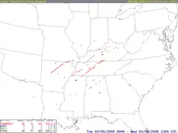 A total of 57 people were killed across four states and 18 counties, with hundreds of others injured.[4] The outbreak, at the time, was the deadliest in the era of modern NEXRAD doppler radar, which was fully implemented in 1997.[5] The event was the second deadliest in February since 1950 behind the February 1971 Mississippi Valley tornado outbreak, which killed 123,[6] the deadliest outbreak in both Tennessee and Kentucky since the 1974 Super Outbreak,[7] and was at the time the deadliest tornado outbreak in the US overall since the 1985 United States–Canada tornado outbreak which killed 76 people.[8] This record would not be surpassed until the 2011 Super Outbreak which killed 324 people. Damage from tornadoes was estimated at over $500 million (2008 USD).[9]