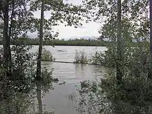 The summer of 2008 was an unusually wet one for central Alaska. In June, the National Weather Service recorded 2.1 inches (53 mm) of precipitation at the Fairbanks International Airport—the most in that month since June 1994, and 0.68 inches (17 mm) above average.[1] By July 27, 1.47 inches of rain had fallen in July. This was slightly below the average for the month at that time (1.49 inches), but the year-to-date rainfall total was still one and two-thirds inches above normal.[2] The next day, July 28, 1.14 inches of rain fell in Fairbanks, setting a single-day Fairbanks rainfall total for that date,[3] with heavier amounts measured east of the town.[4][5] Scattered locations between Salcha and Delta Junction received up to four inches of precipitation. On the 29th, another 0.77 inches of rain fell in Fairbanks—another record for the date—and again, locations outside of the town received greater amounts.[6] Just 0.14 inches of rain fell on the 30th, but on the 31st, 0.6 inches fell. This amount was not a record for the date, but it brought the overall rainfall total in Fairbanks for the month of July to 4.12 inches—more than double the normal average of 1.73 inches (44 mm) of rain.[7] At Eielson Air Force Base, which lies to the southwest of Fairbanks, 7.30 inches of rain were recorded as having fallen in July, making it the rainiest July ever recorded and the second-rainiest month ever recorded at the base.[8] Though more rain fell on August 1 and afterward,[9] the Tanana, Salcha, and Chena rivers had already crested.[10]