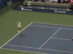 The first session of play on Day 14 saw Murray round off his victory against Nadal, 6–2, 7–6(5) 4–6, 6–4. Play resumed on Arthur Ashe Stadium, and Nadal won all three of his service games, fending off one break point from Murray in the process, to win the third set. Both players then had opportunities to break at the start of the fourth. Nadal had one in the first game, and Murray had seven in the second; this second game spanned a total of twenty-two points, and took 15 minutes to be concluded.[90] The resolute Nadal held out though, and broke Murray to love in the next game. Murray came back into the match, levelling the scores at 3–3; and he broke again to win the match at 5–4. After a somewhat fortuitous net cord at deuce of that game, Murray hit a backhand pass at match point to confirm the win. Murray, who came into the match having failed to beat Nadal in five previous encounters, became the first Briton, male or female, since Greg Rusedski at the 1997 Open to reach the final of a Grand Slam singles tournament. Nadal, who was also playing in his first US Open semifinal, said that, with the number of matches he had played recently taken into consideration, he was pleased with his overall performance at the Open.[91][92] Had the match gone to seeding, Nadal would have been facing his rival, Federer, for a third time in a Grand Slam final in 2008, after having already beaten him at the French Open[93] and Wimbledon.[94]