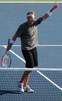 On Day 9, two of the top three seeds, and the two finalists from the previous year, Roger Federer and Novak Djoković, were severely tested. Federer, aiming for his fifth consecutive Open title, was playing twenty-sixth seed Igor Andreev in one of the scheduled night matches on the Arthur Ashe Stadium;[57] he was victorious in five sets, 6–7(5), 7–6(5), 6–3, 3–6, 6–3. Federer struggled to break Andreev's serve in the opening two sets, whereas Andreev broke Federer in the first game of the first, and had seven break points in the early games of the second (Andreev had a low success rate overall, only taking advantage of two out of fifteen break points in the whole match). In the final set Andreev, at 4–2 down, had five further break point opportunities, but failed to convert any as Federer served out the match. Djoković was also pushed to five sets, defeating fifteenth seed Tommy Robredo 4–6, 6–2, 6–3, 5–7, 6–3 in nearly four hours. Robredo broke Djoković's serve at 4–4 the first set, before Djoković won sets two and three with some ease. However, after having broken serve in the fourth, Robredo levelled the match at 3–3, prompting the number three seed to smash his racket, and be the subject of booing from sections of the crowd. Djoković failed to convert break points at 5–5, allowing Robredo to forge a break of his own and take it to a fifth set. Djoković was able to close out the match after breaking at 2–2 in the final set. Djoković was beset by problems related to both a hip injury (for which he required two time-outs) and exhaustion, having been unable to sleep until 4.30 am (UTC−5) on Day 8 after his match with Marin Čilić. Robredo responded by saying, "I think that if you're not fit enough, then don't play." Djoković set up a tie with sixth seed Andy Roddick, who easily beat eleventh seed and Olympic silver medalist Fernando González 6–2, 6–4, 6–1; 2003 champion Roddick acknowledged that he would have to complete an upset to defeat Djoković, despite Djoković's admission that whomever he faced in the next round would be a fitter opponent.[58][59][60] Gilles Müller continued his unexpected run, as he defeated fifth seed Nikolay Davydenko in a demanding match that finished 6–4, 4–6, 6–3, 7–6(10). Müller, who served twenty aces, became the lowest-ranked player, at world number 130, to reach the quarterfinals of the Open since Nicolas Escudé (rank 136) in 1999, and the lowest-ranked at a Grand Slam tournament since Alexander Popp (rank 198) at Wimbledon 2003. He was also the first Luxembourgian to reach the quarterfinal stage of a Grand Slam.[61]