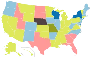 After the election, Democrats controlled both houses in the state legislatures of 27 states: Alabama, Arkansas, California, Colorado, Connecticut, Delaware, Hawaii, Illinois, Iowa, Louisiana, Maine, Maryland, Massachusetts, Minnesota, Mississippi, Nevada, New Hampshire, New Jersey, New Mexico, New York, North Carolina,[7] Oregon, Rhode Island, Vermont, Washington, West Virginia, and Wisconsin.