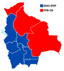 | Movement for Socialism | Evo Morales | 2,943,209 | 64.22 | 88 | +16 | 26 | +14 | ||