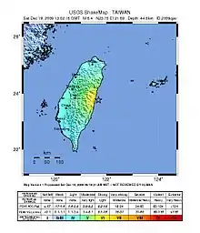 The 2009 Hualien earthquake occurred on December 19 at 21:02:14 (local time) with a moment magnitude of 6.4 and a maximum Mercalli intensity of VI (Strong). The oblique-slip event took place off the coast of Hualien, Taiwan. Strong shaking could be felt in Hualien City (Shindo 5 according to Central Weather Bureau) and Taipei (Shindo 4 according to Central Weather Bureau).[2] The earthquake could also be felt in Hong Kong[3] and Xiamen, China,[4] and on several islands between Yonaguni and Tarama, Japan.[5]