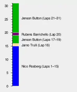 Due to the torrential rain, the race was stopped on the 33rd lap[5] and the results were taken from the classification at the end of lap 31 (the penultimate fully completed in accordance with sporting regulation 42.8[19]). Half-points were subsequently awarded to the top eight. The race was the fifth out of six races in Formula One to be abandoned before 75% distance: the others were the 1975 Spanish and Austrian Grands Prix, the 1984 Monaco Grand Prix, the 1991 Australian Grand Prix and the 2021 Belgian Grand Prix. Button took his second victory of the season and five points, and it was the first time he had won back to back victories and his third career victory. The victory also meant that Brawn GP became the first team since Alfa Romeo in 1950 to win their first two Grands Prix.[7] Nick Heidfeld was classified second ahead of Toyota's Timo Glock.[18] Heidfeld was the first driver to take a podium position with a KERS-equipped car.