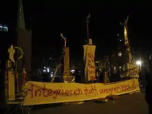 The committee's campaign featured posters featuring a drawing of a Muslim woman in an abaya and niqab, next to a number of minarets on a Swiss flag pictured in a way "reminiscent of missiles".[13] The Swiss People's Party also published a similar poster, with the minarets protruding through a Swiss flag.[14] A few days before the election, campaigners drove a vehicle near Geneva Mosque in the Le Petit-Saconnex imitating the adhan, the Islamic call to ritual prayer (salat) using loudspeakers.[15] Its neighbourhood voted by 1,942 votes to 1,240 to reject the ban.[16]
