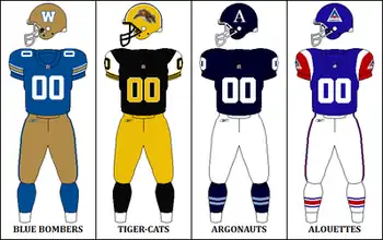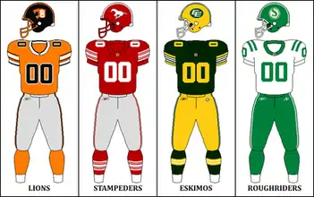 As the league approaches the 100th Grey Cup, the CFL will celebrate the 1970s with all eight teams wearing retro-themed uniforms from that era during Weeks 6 and 7.[1] Since Saskatchewan's alternate jersey is a version of the 1970s home jersey, they were the only team to wear both home and away retro jerseys during these games.