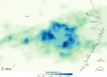 Flooding on the Yalu River in Liaoning affected the city of Dandong in early August. Provincial authorities suspended shipping on the river[75] and more than 40,000 people were evacuated from the city.[77] Heavy rains brought shipping to a halt by August 19,[78] and on August 21 the Yalu breached its banks. About 250,000 people in northeastern China were evacuated, including 94,000 in Dandong, where four people were killed and one missing[63] in Kuandian Manchu Autonomous County.[79] The rain and flooding cut rail services and destroyed more than 200 houses.[80] At least 1,200 people were trapped by flood water. Dandong on the Chinese side and Sinuiju on the North Korean side were affected. Much of North Korea's trade with the world depends on Sinuiju, which is a vital lifeline for the country.[80] The river's flow hit a peak of 27,000 m3/s on August 21, flooding 44 townships and causing 158 embankment breaches. Rainfall up to 250 millimetres (9.8 in) in 24 hours was expected on August 23.[81] Water levels at one station in Dandong rose 2.5 metres (8.2 ft) above the warning level, the second-highest measurement since 1934.[79] Floods also covered roads and farms in Tieling City, affecting 20,000 people.[82] In Huludao City, ten workers were stranded on an island created by flooding before being rescued, after China National Highway 102 was disrupted by floodwaters.[74] Another series of floods left eight dead and one missing in Dandong by August 27.[78] A developing tropical storm was forecast to bring more heavy rains to the Yalu River region by August 28.[83]