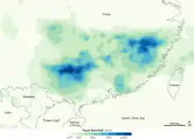 In Huilai County in Guangdong, 604 millimetres (23.8 in) of rain fell in six hours, the fastest rainfall accumulation recorded there in approximately 50 years. Three deaths occurred in the province with two missing, while 550,000 people were affected and 80,000 relocated.[29]