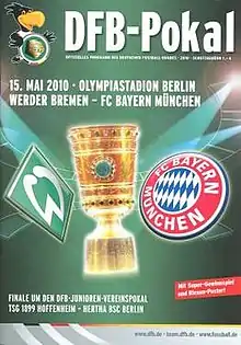 The 2009–10 DFB-Pokal season came to a close on 15 May 2010 when Bayern Munich played defending champions Werder Bremen at the Olympiastadion in Berlin. Bayern thrashed Bremen 4-0 with goals from Robben, Olić, Ribéry, and Schweinsteiger. The title capped off a successful season, with Bayern winning the domestic double of the Fußball-Bundesliga and the DFB-Pokal. These successes were Bayern's 22nd league and 15th cup titles.[3] Bayern were also in line for The Treble but lost to Internazionale of Milan, 2-0 in the Champions League Final[4] at Madrid's Santiago Bernabéu Stadium on 22 May.[5]