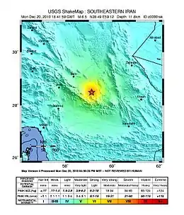 The 2010 Hosseinabad earthquake occurred on December 20 at 22:11 local time (18:41 UTC) with a moment magnitude of 6.6 and a maximum Mercalli intensity of VIII (Severe). It was located about 20 km from Hosseinabad (spelled variously as Ḩoseynābād or Hosein Abad) (Persian: حسين آباد), Kermān Province in south-eastern Iran, about 100 km from Bam.[2][3]