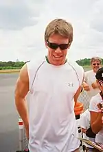Afterward, during qualifying, forty-six cars were entered, but only forty-three were able to race because of NASCAR's qualifying procedure.[12] Edwards clinched his seventh pole position during his career, with a time of 26.395, which made a new track record.[3][13] He was joined on the front row of the grid by Allmendinger.[13] Kurt Busch qualified third, Biffle took fourth, and Jamie McMurray started fifth.[13] Hamlin, one of the drivers in the Chase for the Sprint Cup, qualified seventeenth, while Johnson was scored twenty-first.[13] The three drivers that failed to qualify for the race were Joe Nemechek, Michael McDowell, and Jason Leffler.[13] Once the qualifying session completed, Edwards commented, "The first thing that we’re going to have an advantage Sunday is with our pit stall, that’s going to help us a lot. I think we have an advantage because [the title rivals] have to be a little bit conservative. Guys like myself we’re really battling for fourth in points and battling for wins. We can go out and be a little more aggressive and maybe take advantage of that."[3]
