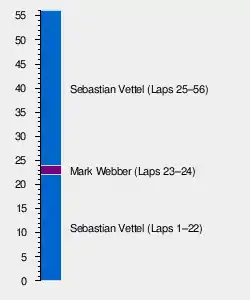 Kobayashi, Schumacher and Liuzzi retired in quick succession on laps 8,9 and 12 with engine, loose wheel nut[8] and throttle failures respectively. This left the top 10 as: Vettel, Webber, Rosberg, Kubica, Sutil, Hülkenberg, Hamilton, Jaime Alguersuari, Massa and Alonso. Button had passed Alonso on lap 9, but then immediately pitted to change to the harder tyres. He was the first man to pit. He resumed on a clear track, and immediately set the fastest lap of the race, with a 1:41.044. Hülkenberg soon pitted, releasing Hamilton, who immediately ran under 1:41, setting a 1:40.9 on lap 16. He had improved that to a 1:40.4 by lap 20, when Rosberg, Kubica, and Sutil all pitted. The Red Bulls stayed out until laps 24 and 25, with Vettel coming in first. He rejoined side by side with Hamilton, but got ahead taking the inside line on Turn 1. Webber's pit stop was not as smooth, with a problem on his wheelnut costing him 2 seconds, and he rejoined 4 seconds behind teammate Vettel, with Hamilton in between. Vettel immediately got into the 1:39s with a lap of 1:39.854. Webber responded by going two tenths quicker on the next lap. The top 10 at the end of lap 26 were: Vettel, Hamilton, Webber, Rosberg, Kubica, Massa, Alonso, Sutil, Button, and Hülkenberg.
