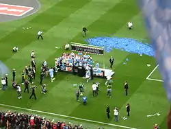 Manchester City elected not to parade the trophy at the match as they did not wish to be seen as 'crass' in front of the visiting Stoke City supporters.[82] Instead, Manchester City were invited by Manchester City Council to host an open-top bus parade through the City of Manchester in celebration of their victory. The parade took place on 23 May 2011 and began at 18:00 starting at Albert Square outside Manchester Town Hall where 10,000 people were present to see the team set off on the bus parade with various streets of the city centre closed by 12:00 in preparation for the parade.[83] The open-top bus then travelled out of Manchester city centre via Princess Street, Portland Street, Piccadilly Gardens, Newton Street on onto Great Ancoats Street.[84] The parade finally reached Ashton New Road where thousands supporters were waiting at the gates of the City of Manchester Stadium to welcome the team home. The parade culminated in a special reception at the stadium, where 40,000 who claimed free tickets for the event were waiting.[85] Greater Manchester Police estimated that the parade attracted a crowd in excess of 100,000.[86]