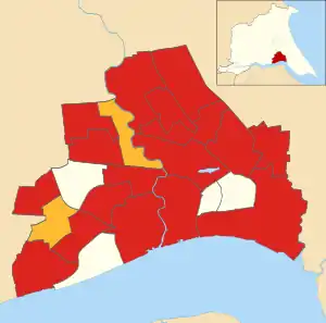 Map of the results of the 2011 Hull council election. Labour in red, Liberal Democrats in yellow, Uncontested in cream.
