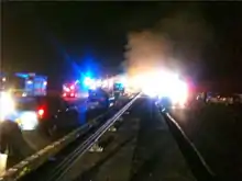 | Property damage | 34 vehicles; road surface scorched, debris fused into road surface; safety barrier damage |
