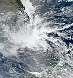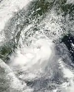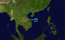Late on July 8, an area of low pressure formed about 300 km (190 mi) east of Aurora. The center was 460 km (290 mi) north of Basco, Batanes.[43] On the morning of July 9, JMA upgraded the system to a tropical depression. It was located 450 km (280 mi) northeast of Cagayan. In the afternoon, PAGASA upgraded the low-pressure area into a tropical depression and named it Goring.[44] After making landfall on Fujian, China, it dissipated on the evening on July 10. However, the JMA classified the system as a tropical depression until the evening of July 10.