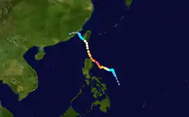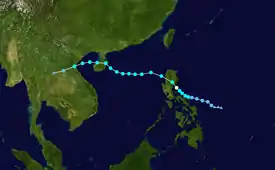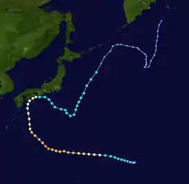 On May 3, the JTWC started to monitor a tropical disturbance that had developed within a monsoon trough about 140 km (85 mi) to the west of Palau.[27] At this time the disturbances low level circulation center was weak and unorganized, while a minimal amount of deep convection was observed around the system.[27] Over the next couple of days the depression gradually developed further in an area of low vertical wind shear before it was declared a tropical depression by the JMA and the JTWC during May 6.[28] In the same evening, PAGASA upgraded the low pressure into a tropical depression and assigned its local name 'Bebeng'. On the afternoon of May 7, JMA upgraded the depression to a tropical storm and assigned the name 'Aere'. During the early morning of May 12, the JMA downgraded Aere to a tropical depression while south of Kyushu Island as it became a weak extratropical cyclone. It's extratropical remnants finally dissipated on May 15.