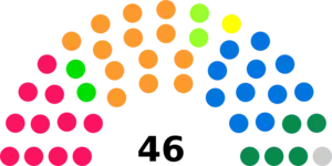 | Parties | Abbr. | Alignment | Ideology | Votes[2] | % | +/– (%) | Seats | % | +/– (seats) | |