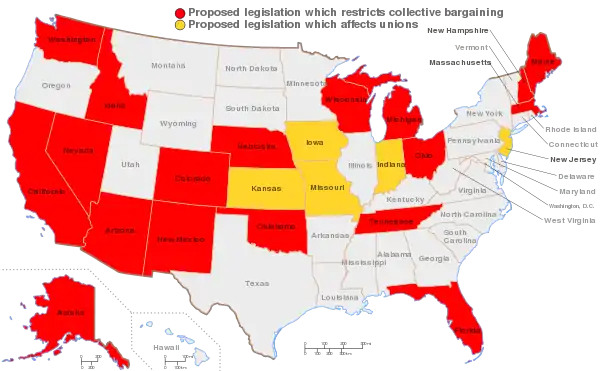 In February 2011, a series of public employee protests began in the United States against proposed legislation which would weaken the power of labor unions. By March, eighteen states had proposed legislation which would remove some collective bargaining powers from unions, along with another five states which proposed legislation which would negatively affect unions.[1] The protests occurred when public employee unions mounted protests against legislation proposed by Republican governors such as Scott Walker (Wisconsin), Rick Scott (Florida), Mitch Daniels (Indiana), Sean Parnell (Alaska), Rick Snyder (Michigan), John Kasich (Ohio), Paul LePage (Maine) and Jan Brewer (Arizona) which, among other things, would strip public employees of some collective bargaining rights as well as require higher employee contributions to pension and health care plans. The governors stated they needed these changes in order to cut state spending and balance the states' budgets. The protests began in Wisconsin,[2][3] then spread to Indiana and Ohio, with unions around the country rallying to show their opposition to the proposed legislation.[4][5] Several other states considered similar legislation.[6][7][8] Virginia, North Carolina, and Texas prohibit formal collective bargaining with public employees.[9]