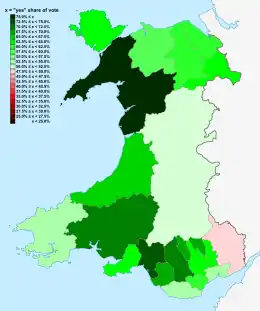 Turnout was highest in Carmarthenshire (44.36%) and lowest in Wrexham (27.04%). The highest percentage of Yes votes was in Gwynedd (76.03% Yes) and the highest percentage of No votes was in Monmouthshire (50.64% No).