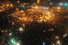 On 30 June 2013, prior to the anti-government protests, Morsi supporters gathered in Rabaa el-Adaweya square to celebrate the one-year anniversary of Morsi's inauguration. In turn, tens of thousands of Morsi opponents massed in Tahrir Square and outside the Heliopolis palace demanding Morsi's resignation and pre-term presidential elections.[37] Demonstrations were also reported in 18 locations across Cairo[38] and in other different locations across the country including Alexandria, El-Mahalla and cities in the Suez Canal region.[39][40] Various political organizations supported the demonstrations, including the Tamarod movement formed by members of the Egyptian Movement for Change, which claimed to have collected 22 million signatures calling for Morsi's resignation.[41][42]