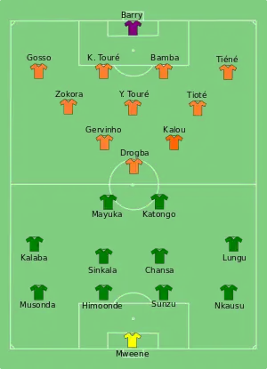 Ivory Coast also appeared in their third final. They won it in 1992 and lost in 2006. The "Elephants" had gone through the tournament so far without conceding a goal and winning all of their matches. It started with a victory against Sudan,[11] followed by two wins against Burkina Faso[12] and Angola, the latter one without some of the best players.[13] The quarterfinal was won against co-host Equatorial Guinea,[14] before Mali was beaten 1–0.[15] Didier Drogba joins Katongo and Mayuka with three goals himself at the top of the goalscorers.