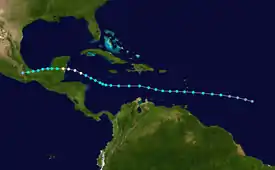 A tropical wave developed into Tropical Depression Five on August 1, while located about 810 miles (1,305 km) east of the Lesser Antilles. Wind shear initially caused the depression to remain weak, though by August 2, it was upgraded to Tropical Storm Ernesto. The next day, Ernesto entered the Caribbean Sea. As the storm approached the western Caribbean on August 5, wind shear and dry air briefly halted strengthening; convection diminished, exposing the low-level circulation, which had become somewhat less defined. After the wind shear and dry air decreased, Ernesto regained deep convection and became a hurricane on August 6. Early on August 8, it made landfall in Costa Maya, Quintana Roo as with winds of 100 mph (160 km/h). A few hours later, a minimum barometric pressure of 973 mbar (28.7 inHg) was recorded. After weakening to a tropical storm and moving into the Bay of Campeche, the storm struck Coatzacoalcos, Veracruz on August 9. It weakened over Mexico and dissipated on August 10. The remnants contributed to the development of Tropical Storm Hector in the eastern Pacific.[23]