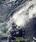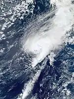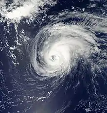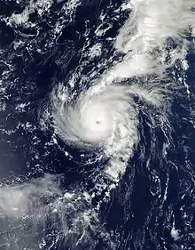 There were only two tropical cyclones that formed in September, though three systems that existed in that month originated in August.[18] Michael became the first major hurricane of the season on September 6, when it peaked as a Category 3 hurricane.[25] Hurricane Nadine developed September 10 and became extratropical on September 21. However, Nadine re-developed on September 23 and subsequently lasted until October 3. With a total duration of 24 days, Nadine was the fourth-longest lasting Atlantic tropical cyclone on record, behind the 1899 San Ciriaco hurricane, Hurricane Ginger in 1971, and Hurricane Inga in 1969.[26] In October, there were five tropical cyclones – Tropical Storms Oscar, Patty, and Tony – as well as Hurricanes Rafael and Sandy.[18] This was well above average, yet not record, activity for the month of October.[27] Hurricane Sandy outlived the final named storm, Tony, and became extratropical on October 29, ending cyclonic activity in the 2012 season.[18]