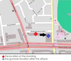 At around 17:40 EET, Vlădan entered the hairdressing salon Perla (English language: Pearl), located in the Dorobanți neighborhood in Sector 1, Bucharest, at the intersection of Calea Dorobanți and Iancu de Hunedoara Boulevard. He was armed with a 9×19mm Glock semi-automatic pistol. Vlădan opened fire, shooting eight people in total. He fired eleven bullets, from which three hit his wife. The rest of the bullets were fired at the victims, and all of them hit the targets.[3] At about 17:45, the shooter fled the scene and hid inside a public building. He turned himself in a few minutes after that.[4]