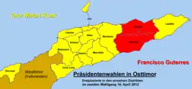 Presidential elections were held in East Timor on 17 March 2012, with a second round on 16 April 2012.[1] Incumbent president Jose Ramos-Horta, who was eligible for a second and final term as president, announced that he would seek nomination to be a candidate in the election.[2] The election was seen as a test for the "young democracy" in seeking to take control of its own security.[3] Former military commander Taur Matan Ruak provisionally beat Francisco Guterres in a second round runoff.