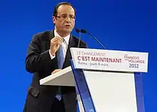 The 2011 French Socialist Party presidential primary was the first open primary (primaires citoyennes), jointly held by the French Socialist Party and Radical Party of the Left[2][3][4] for selecting their candidate for the 2012 presidential election. Voters had to donate at least one Euro and sign a pledge to the values of the Left to be eligible.[5][6] The filing deadline for primary nomination papers was fixed on 13 July 2011 and six candidates competed in the first round of the vote. On election day, 9 October 2011, no candidate won at least 50% of the vote therefore the two candidates with the most votes contested a runoff election on 16 October 2011: François Hollande won the primary, defeating Martine Aubry.[7] The idea for holding an open primary to choose the Socialist Party candidate was originally suggested in 2008 by the left-leaning think tank Terra Nova.[8]