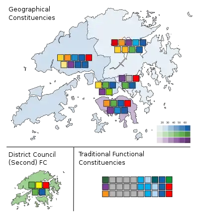 The election was for the new total of 70 seats in LegCo, ten more than previously, with 35 members elected in geographical constituencies through direct elections, and 35 members in functional constituencies.[1] Under new arrangements agreed in a contentious LegCo vote in 2010, five District Council (Second) functional constituency seats each represent all 18 District Councils of Hong Kong voted for by all resident voters in Hong Kong (who did not have a vote in any other functional constituency), effectively increasing the number of seats elected with universal suffrage to 40.[2]