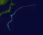 On May 20, the JMA reported that a tropical depression had developed about 525 km (325 mi) to the southeast of Guam.[21] During May 21, the JTWC also upgraded the system to a tropical depression later. Early on May 22, the JMA upgraded the system to a tropical storm and named it Sanvu. Late on May 23, the JTWC upgraded Sanvu to a category 1 typhoon, for the system became compact and more organized as an eye was forming. After being upgraded to a severe tropical storm by the JMA late on May 24, Sanvu's eye directly passed over Iwo Jima late on May 25. On May 26, strong vertical wind sheer and cool sea surface temperature caused weaker convection around Sanvu, and the eye began to dissipate. The JTWC downgraded Sanvu to a tropical storm late on May 26, followed by the JMA early on May 27, as the system's low level circulation centre started to become exposed. Late on May 27, the JMA reported that Sanvu had degenerated into an extratropical low, before the remnants dissipated during May 30.[21]