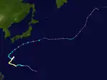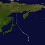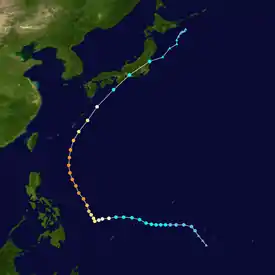 On May 29, a tropical disturbance formed northwest of Palau. On May 30, the disturbance began moving northwestwards, as it slowly strengthened. On May 31, the system's convection became significantly organized near Samar prompting the JTWC to issue a TCFA. Later that day, the PAGASA upgraded the low-pressure area to a tropical depression and assigned its local name Ambo, and the JTWC upgraded the disturbance into a tropical depression. On June 1, the JMA upgraded the system to a tropical storm and named it Mawar. On June 2, the JMA upgraded Mawar to a severe tropical storm, and the JTWC upgraded it to a category 1 typhoon as the convection began to wrap up and organize. On June 3, the JMA upgraded Mawar to a typhoon after the JTWC upgraded it to a category 2 typhoon. Early on June 4, the JTWC upgraded Mawar to a category 3 typhoon but downgraded it to a category 2 typhoon only six hours later, due to increasing wind shear coming from a subtropical jet stream located over Japan. On June 5, Mawar started its extratropical transition, and the JMA downgraded Mawar to a severe tropical storm. On June 6, Mawar fully became extratropical cyclone and dissipated east of the Kamchatka Peninsula on June 13.[23]
