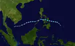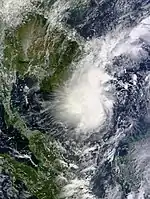 On June 25, the JMA started to monitor a tropical depression that had developed, within the monsoon trough about 1,585 km (985 mi) to the southeast of Manila, Philippines.[31][32] During that day the depression moved north-westwards and consolidated further before during the next day, PAGASA started to monitor it as Tropical Depression Dindo.[33][34] Later that day, the JMA upgraded the system to a tropical storm and named it Doksuri,[35] and the JTWC upgraded Doksuri to a tropical depression.[36] Late on the same day, the JTWC upgraded Doksuri to a tropical storm.[37] On June 27, Doksuri's low-level circulation center became exposed due to moderate easterly wind shear.[38] On June 28, the JTWC downgraded Doksuri to a tropical depression, as the system's exposed circulation center began to undergo an unusual circulation center replacement cycle, which involves a circulation center to be replaced by another new circulation center.[39] Late on June 29, Doksuri made landfall over Nanshui, Zhuhai, Guangdong, China.[40] During June 30, the JMA reported that Doksuri had weakened into a tropical depression, before reporting that the depression had dissipated later that day.[41] In Macau, the storm caused minor roof damage.[42]