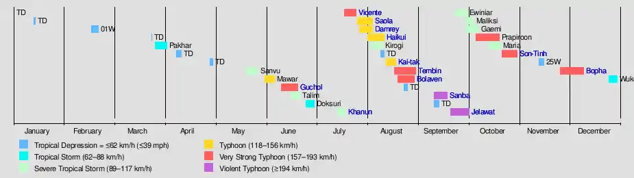 The season's first named storm, Pakhar, developed on March 28 while the last named storm, Wukong, dissipated on December 29. The season became very active between mid-July and mid-August, with nine named storms formed during the period. Vicente underwent explosive intensification and made landfall over the west Pearl River Delta as a strong typhoon. Damrey developed into a typhoon in the Yellow Sea and became the most intense tropical cyclone to make landfall north of the Yangtze River since 1949. Typhoon Haikui, although centred far away from the Philippines, killed at least 89 people in the country. Typhoon Tembin affected Taiwan twice because of its cyclonic loop.
